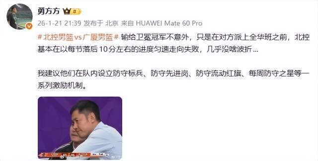 来自北京BTV的记者勇方方老师更是表示,“输给卫冕冠军不意外,只是在对方派上全华班之前,北控基本在以每节落后10分左右的进度匀速走向失败,几乎没啥波折...我建议他们在队内设立防守标兵、防守先进岗、防守流动红旗、每周防守之星等一系列激励机制。”